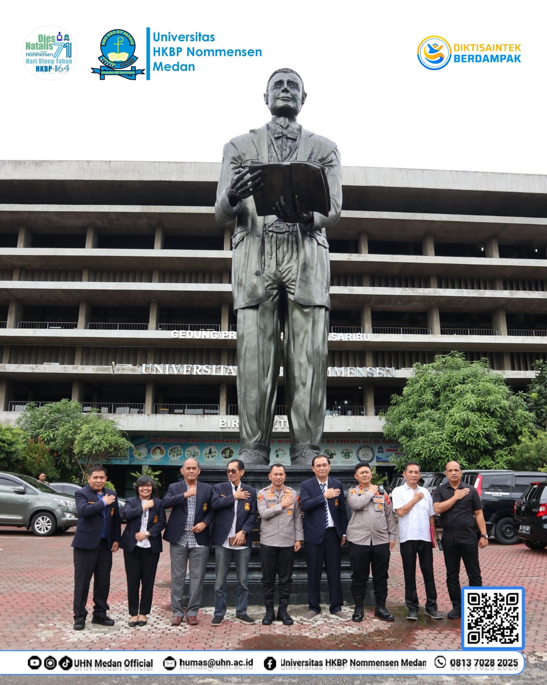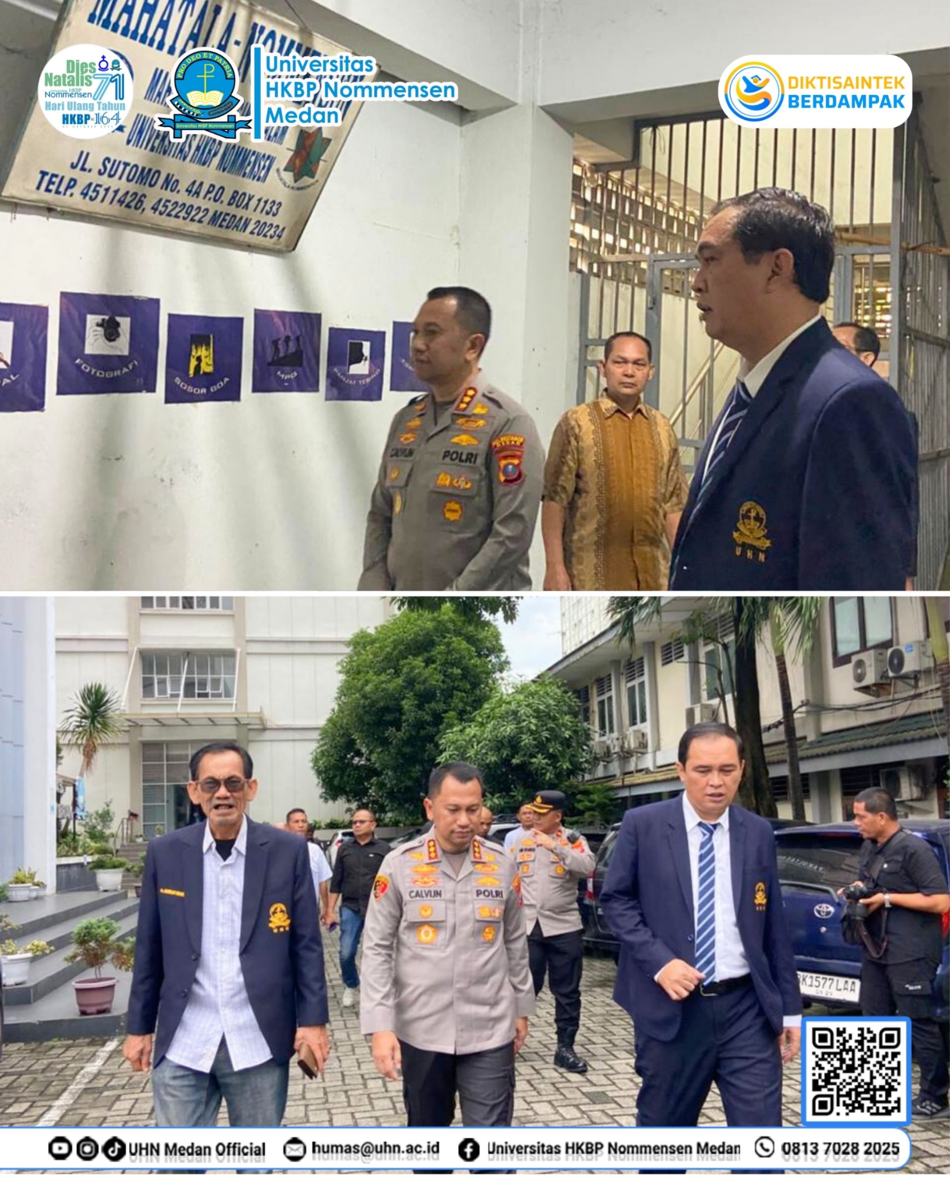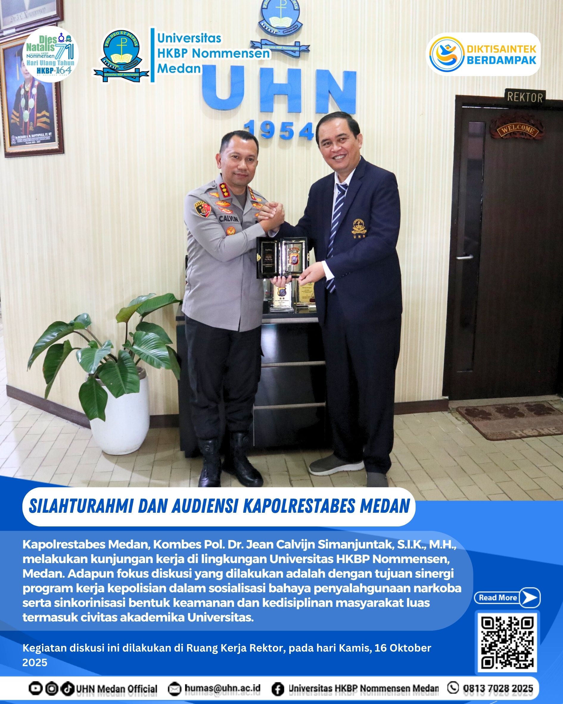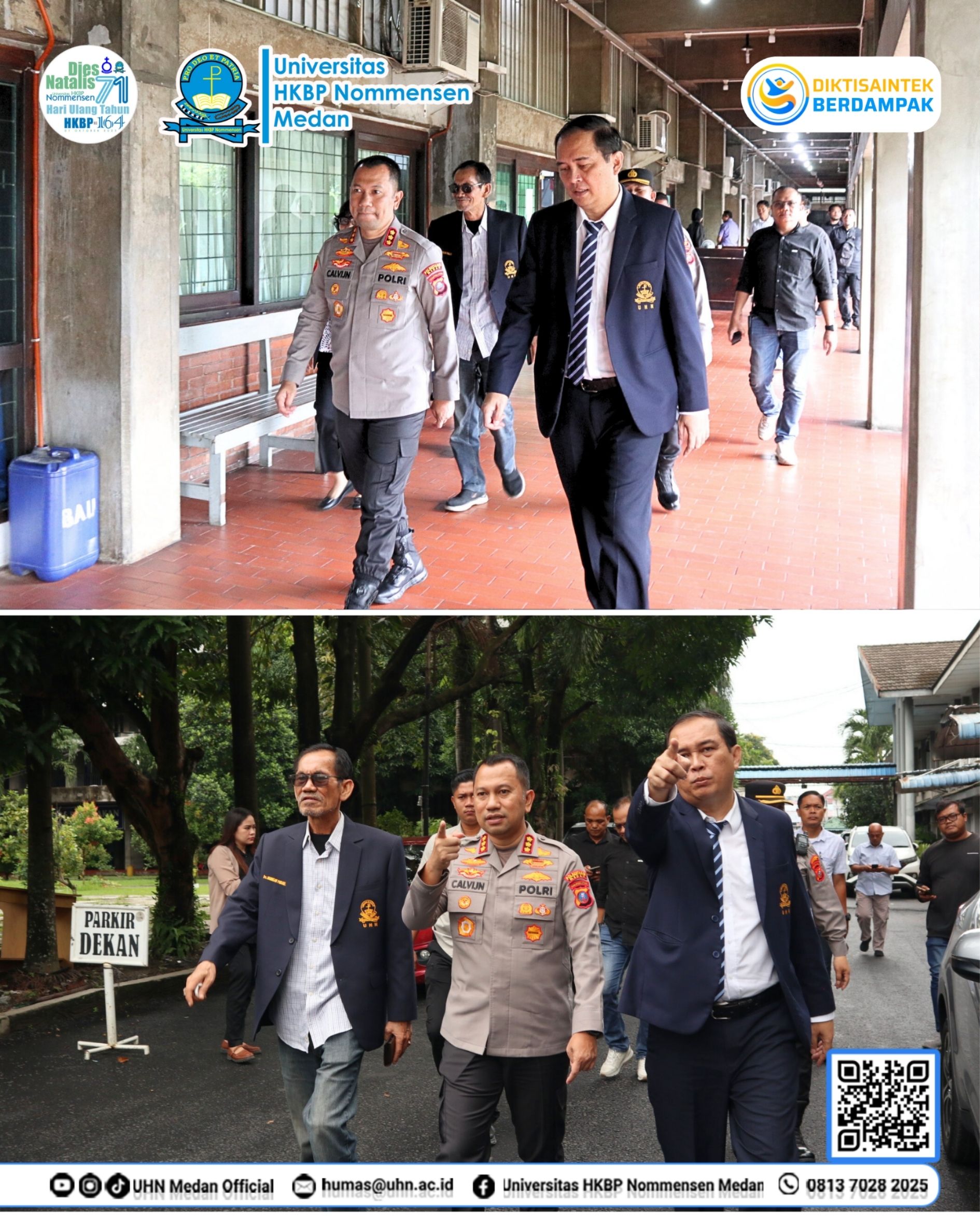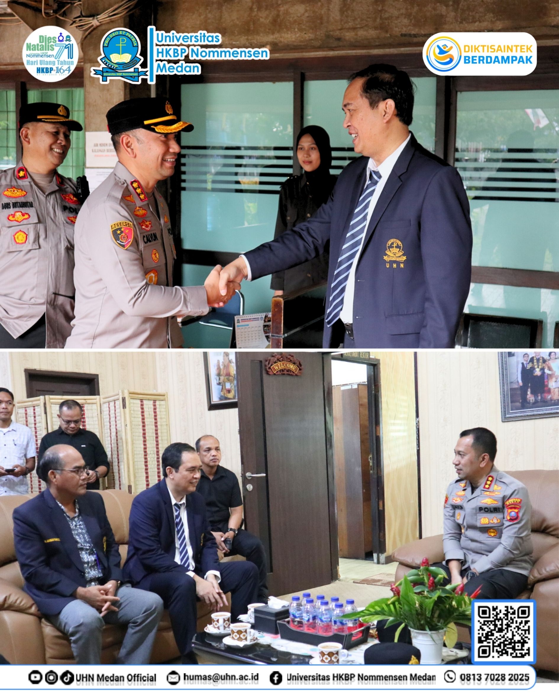 Rektor Universitas HKBP Nommensen Medan Dr. Richard AM Napitupulu, ST., MT didampingi oleh jajaran pimpinan universitas, menerima kunjungan sekaligus silahturahmi dari Kepala Kepolisian Resort Kota Besar (Kapolrestabes) Medan yang baru, Kombes Pol. Dr. Jean Calvijn Simanjuntak, S.I.K., M.H., didampingi Kasat Intelkam Poltabes Medan dan Kapolsek Medan Timur Kompol Agus M Butar-Butar yang juga sebagai alumni Fakultas Hukum UHN Medan di ruang kerja Rektor, Kamis (16/10/2025).