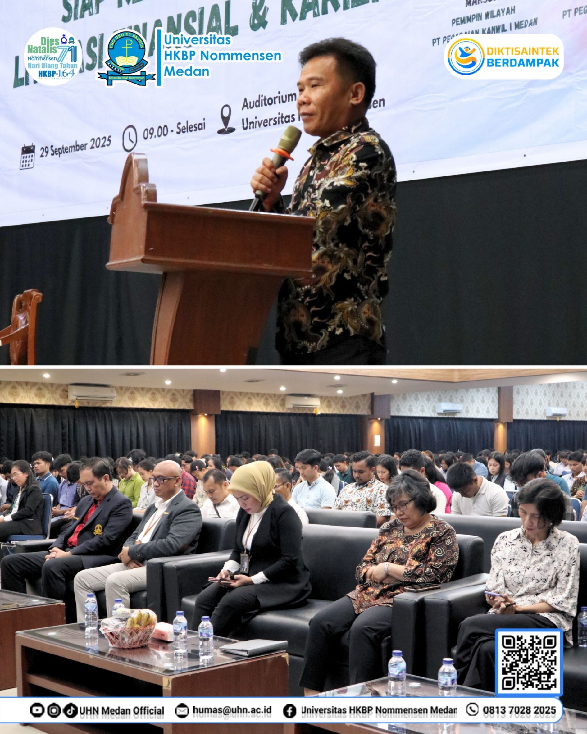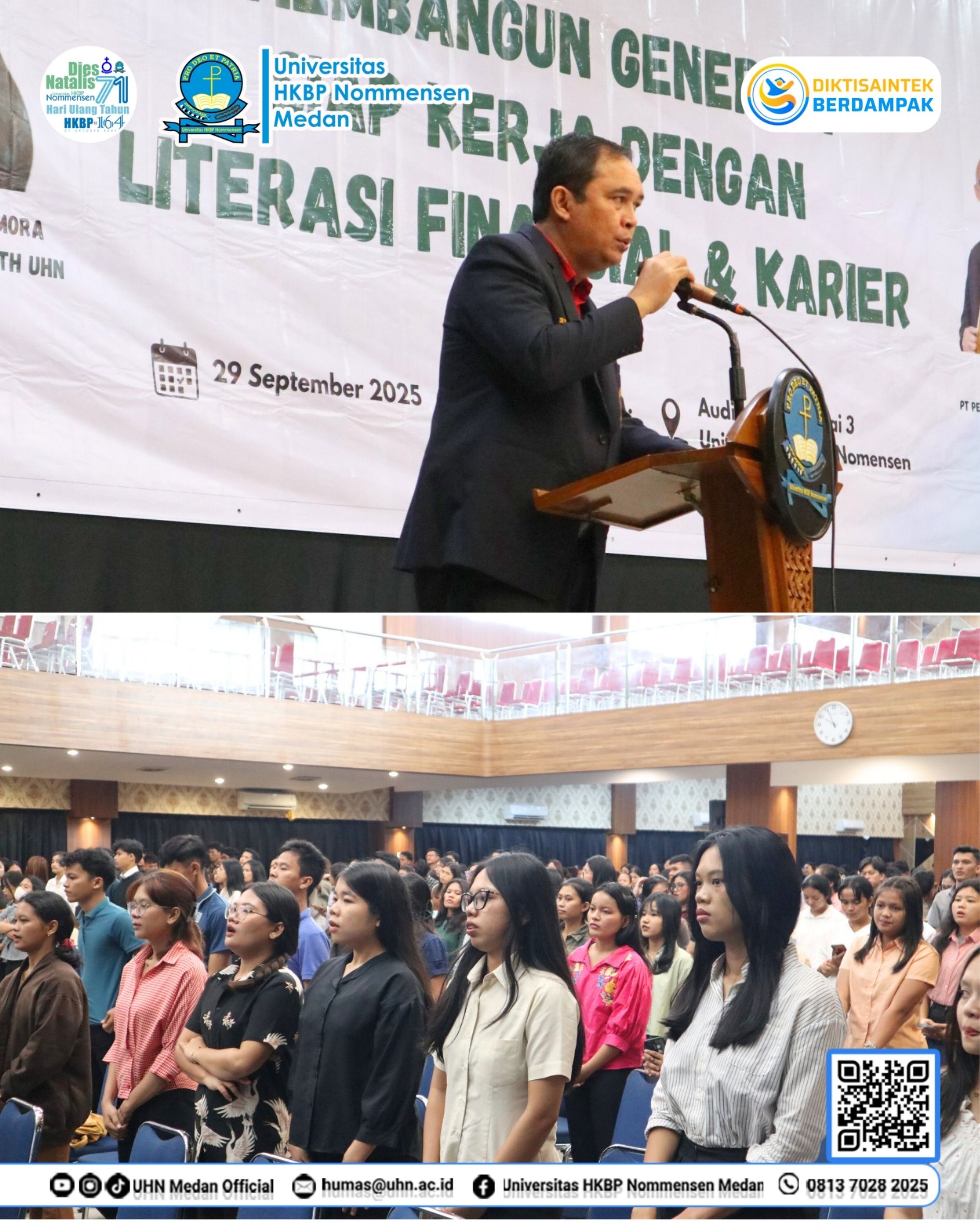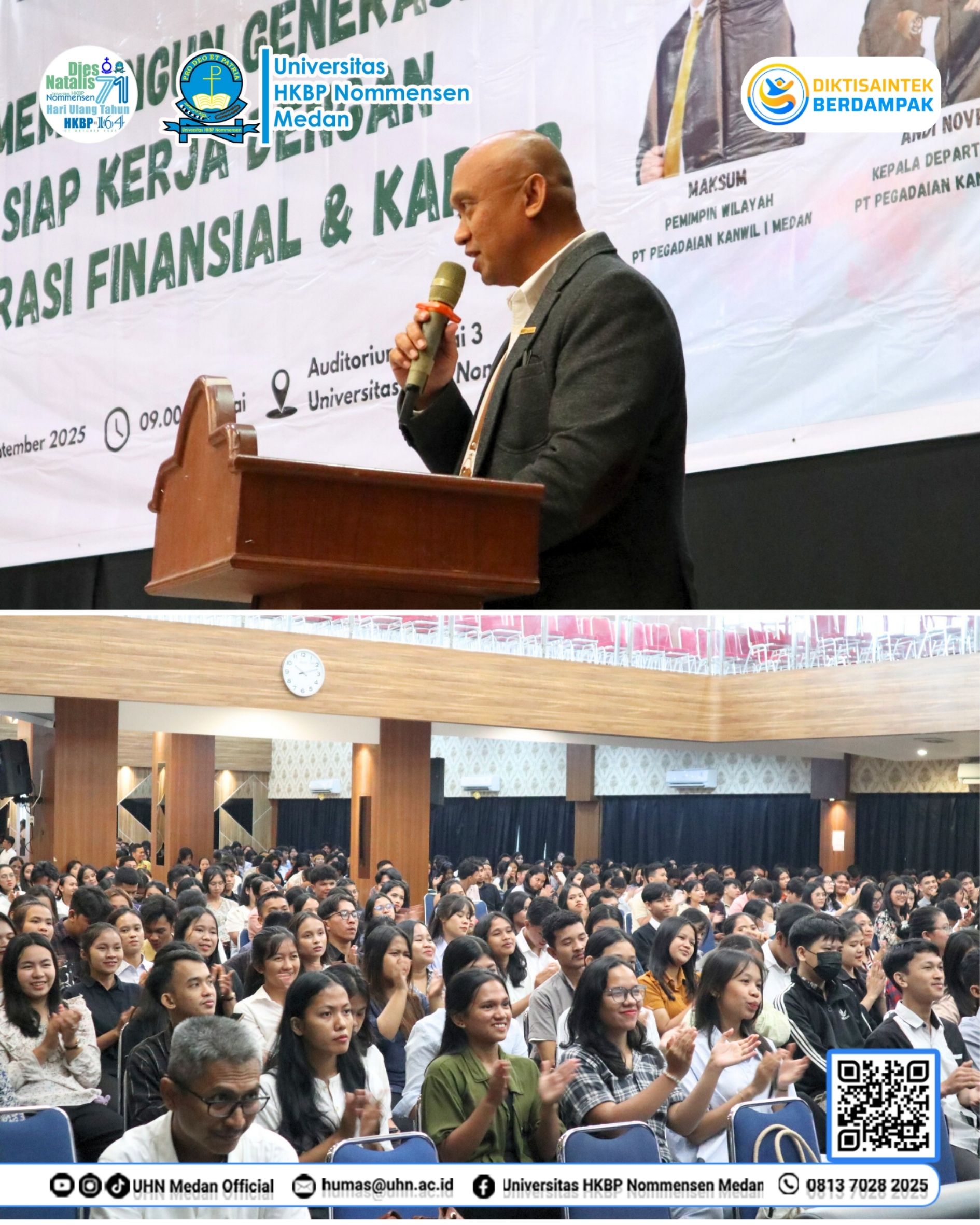 Universitas HKBP Nommensen (UHN Medan) bekerja sama dengan PT. Pegadaian Kanwil 1 Medan sukses menggelar Seminar Literasi bertajuk “Membangun Generasi Siap Kerja dengan Literasi Finansial & Karir”. Kegiatan ini menjadi salah satu rangkaian acara Dies Natalis ke-71 Universitas HKBP Nommensen sekaligus memperingati HUT HKBP ke-164. Seminar dilaksanakan di Auditorium Lantai 3 UHN Medan, Senin 29/9/2025 dengan dihadiri ratusan mahasiswa dari berbagai fakultas.