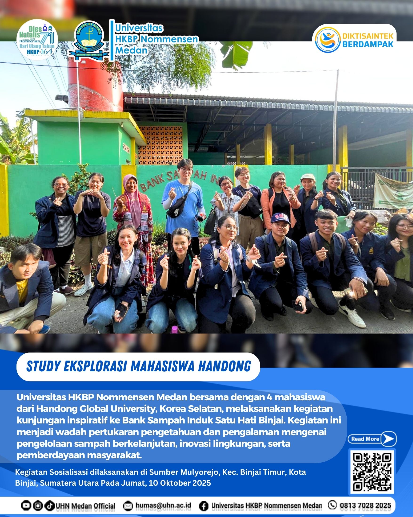 Pada Jumat, 10 Oktober 2025 beberapa mahasiswa dan dosen Universitas HKBP Nommensen Medan bersama dengan 4 mahasiswa dari Handong Global University, Korea Selatan, melaksanakan kegiatan kunjungan inspiratif ke Bank Sampah Induk Satu Hati Binjai. Kegiatan ini menjadi wadah pertukaran pengetahuan dan pengalaman mengenai pengelolaan sampah berkelanjutan, inovasi lingkungan, serta pemberdayaan masyarakat. Melalui kunjungan ini, para mahasiswa belajar langsung tentang pentingnya kolaborasi global dalam menjaga kelestarian bumi dan menciptakan perubahan positif bagi lingkungan. Semangat gotong royong dan kepedulian sosial yang ditunjukkan menjadi cerminan nyata dari nilai-nilai edukatif lintas budaya yang menginspirasi generasi muda.